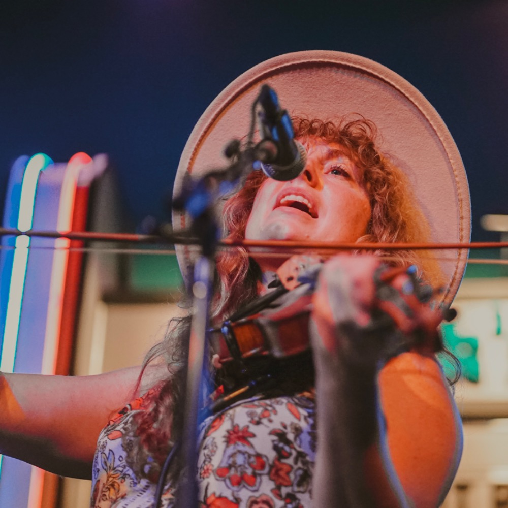 “Folk songs for lonely tumbleweeds" is the self-description of Texas "badass" fiddler, singer, and songwriter Nicole Ridgwell. She opened one of her sets with "Don't Let Me Go Back," just her and her fiddle, alternating instrument and vocals. If one were to invent a story about Ridgwell, it would be this song, with its sense of exile from a small town, the shame of returing. (She lives in Austin, Texas.) She's got a full-throated voice, not afraid to push it to her limits.