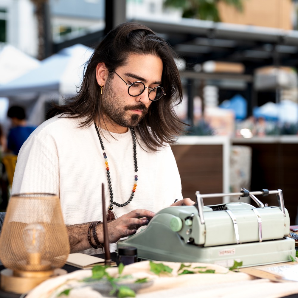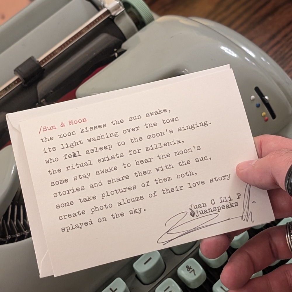 The day is just beginning, and your guests make their way through the venue, the playful sound of typewriter keys on paper captures their attention. They sit across, enthralled by the mystique. They share an idea, they find human connection, a moment of quiet enjoyment, and after a few minutes, they receive a one-of-a-kind poem. A little gift for them to remember your event.