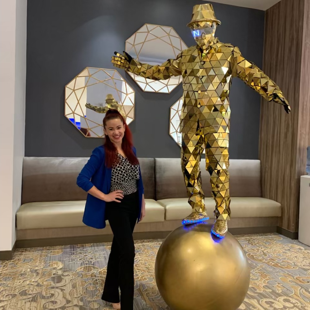 Choose from a sleek Mirror Man look (Gold, Silver, Red, Blue) for a modern, upscale feel, or a bright LED costume that lights up the room and stands out in any space. While ball walking, he can also juggle and spin poi, adding movement and variety that keeps people watching and coming back for more. If you have a specific theme or vibe in mind, we can help match the look and energy to fit your event and LED Branding is available