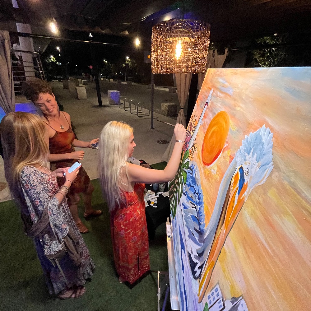 Flamgu creates memorable and engaging experience through color and paint. She facilitates collaborative paintings where the brush is put in the hands of the guests. Each guest makes their mark. She also can create live works in her own with any subject matter. Love paintings are great for fundraiser events. Live personalized art is created in under 10 minutes and is a one on one engagement. With these, each guest is able to take a piece of personalized art home with them.