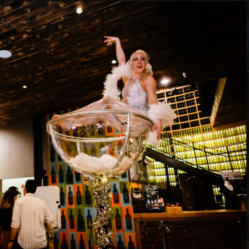 Our Martini Glass Aerialist is a stunning aerial and acrobatic centerpiece for corporate events, galas, and luxury receptions!