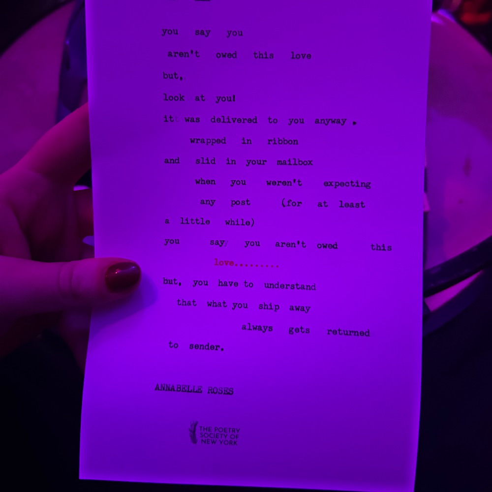 Annabelle holds a BA in Creative Writing and Drama from The University of Salford in Manchester, England and is an Assistant Editor for Milk Press and Wild Garlic magazines. She is represented as a typewriter poet by both The Poetry Society of New York (PSNY) and Ars Poetica and her writing has been published by By The WAYE, PSNY, and elsewhere.